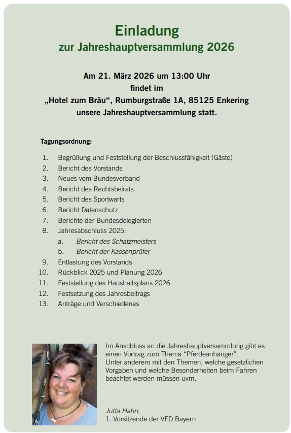 Im Anschluss an die Jahreshauptversammlung gibt es von der Fahrschule Dengler einen Vortrag zum Thema Pferdehänger. Unter anderem mit den Themen, welche gesetzlichen Vorgaben es gibt und welche Besonderheiten beim Fahren beachtet werden müssen.