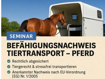 Die DEULA Bayern GmbH Berufsbildungszentrum führt im März 2026 ein Seminar zum Befähigungsnachweis für den Pferdetransport durch.