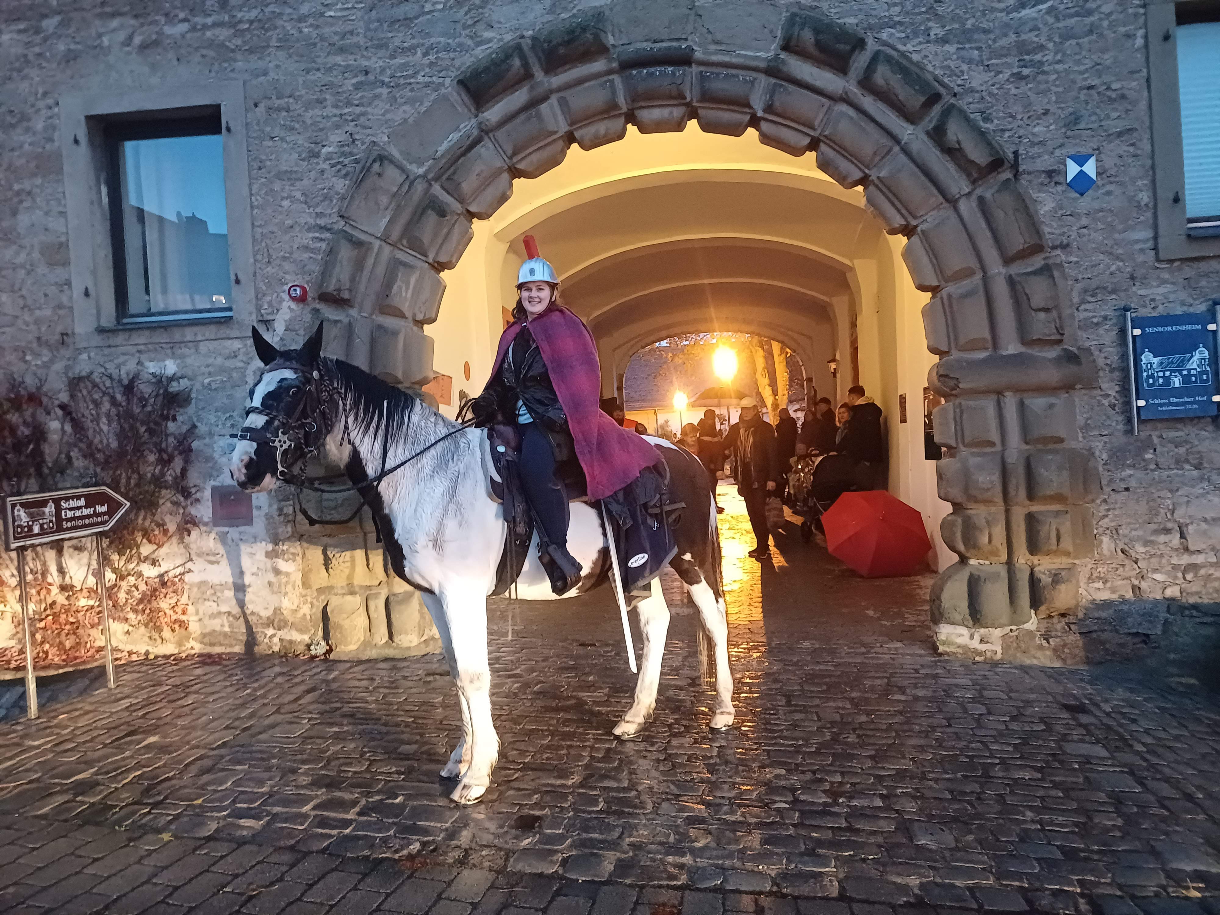 11. November jedes Jahr: Wenn der Laternenzug sich windet, Kinder fröhlich „Rabimmel, Rabammel, Rabumm“ singen und plötzlich ein rhythmisches *Klack-Klack* die Gassen erfüllt, ist eines klar: Auch die Reiterinnen der VFD Gruppe Kitzingen sind wieder unterwegs, um den Geist von St. Martin aufleben zu lassen – jedes Jahr auch trotz Regenwetter mit ebenso viel Elan wie Freude.